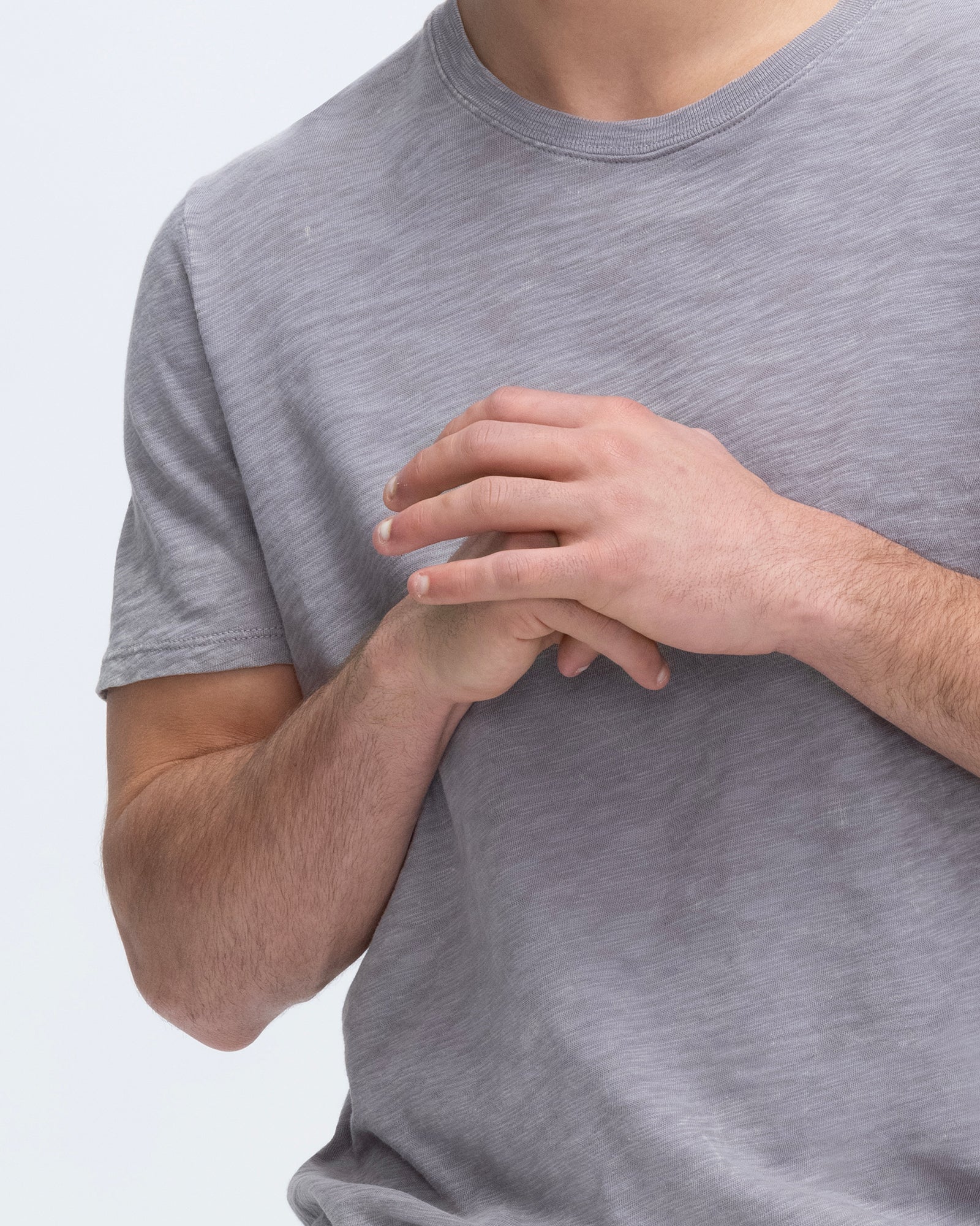 The Slub Jersey Chroma Wash Short Sleeve Crew Neck Tee in Shark is effortlessly cool with a uniquely worn-in feel. Crafted from a heavier-weight cotton with a loose weave, it drapes naturally against the body for a relaxed yet refined look. The sheer finish and signature chroma wash treatment give each piece its own distinctive character. Designed with a classic crew neckline and short sleeves, this tee is a versatile essential with a modern edge.