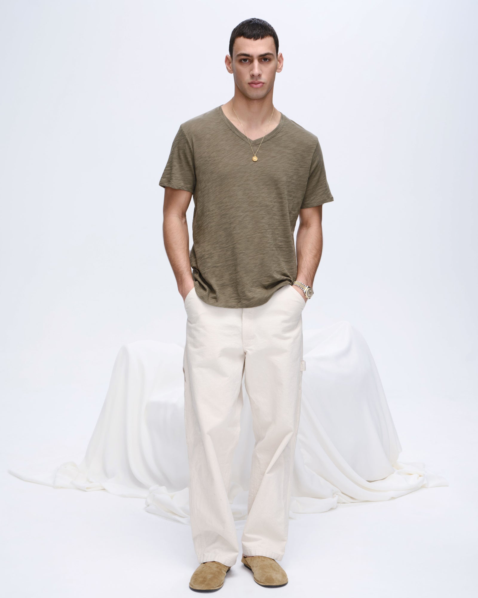 The Slub Jersey V-Neck Tee gets its texture from the uneven yarns of our unique Peruvian Cotton. It features a relaxed v-neck silhouette and just the right amount of sheer. The loose weave of this heavier Cotton molds modestly to the body offering the perfect drape.